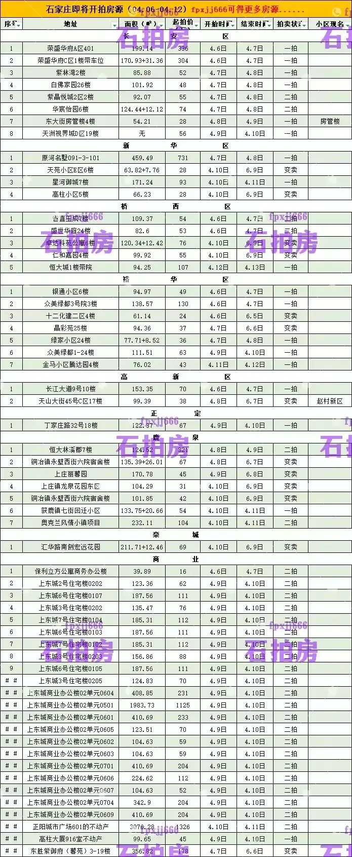 本周即将开拍房源,大家及时关注开拍日期,别错过,有任何问题,请微fpxjj666咨询!!!此表内房源仅为展示,需签约后尽调风险,是否可参拍以报告为准,请知悉。石拍房,买法拍,无风险,有保障!