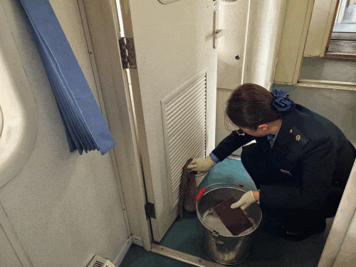 3月28日,京洛车队洛5组值乘K7704次列车,利用终到时间开展全面卫生清理,重点清扫车厢地面、洗面间、卫生间等区域,彻底清除卫生死角,营造整洁舒适的乘车环境。(京洛车队 张倩)