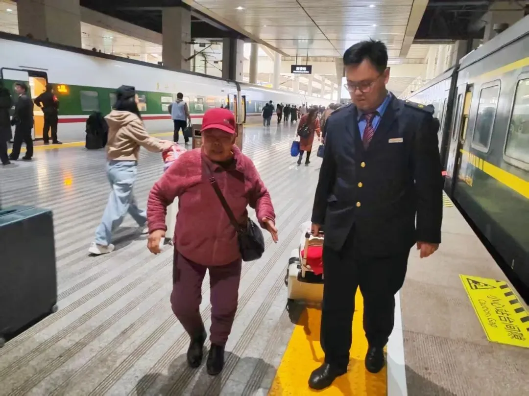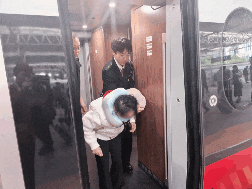4月2日,高铁二队替班2组值乘G321次列车,班组发现重点旅客独自乘车后,主动上前搀扶引导、协助调换座位,途中悉心照料,全程贴心服务获得旅客高度赞扬。(高铁二队 方文武)
