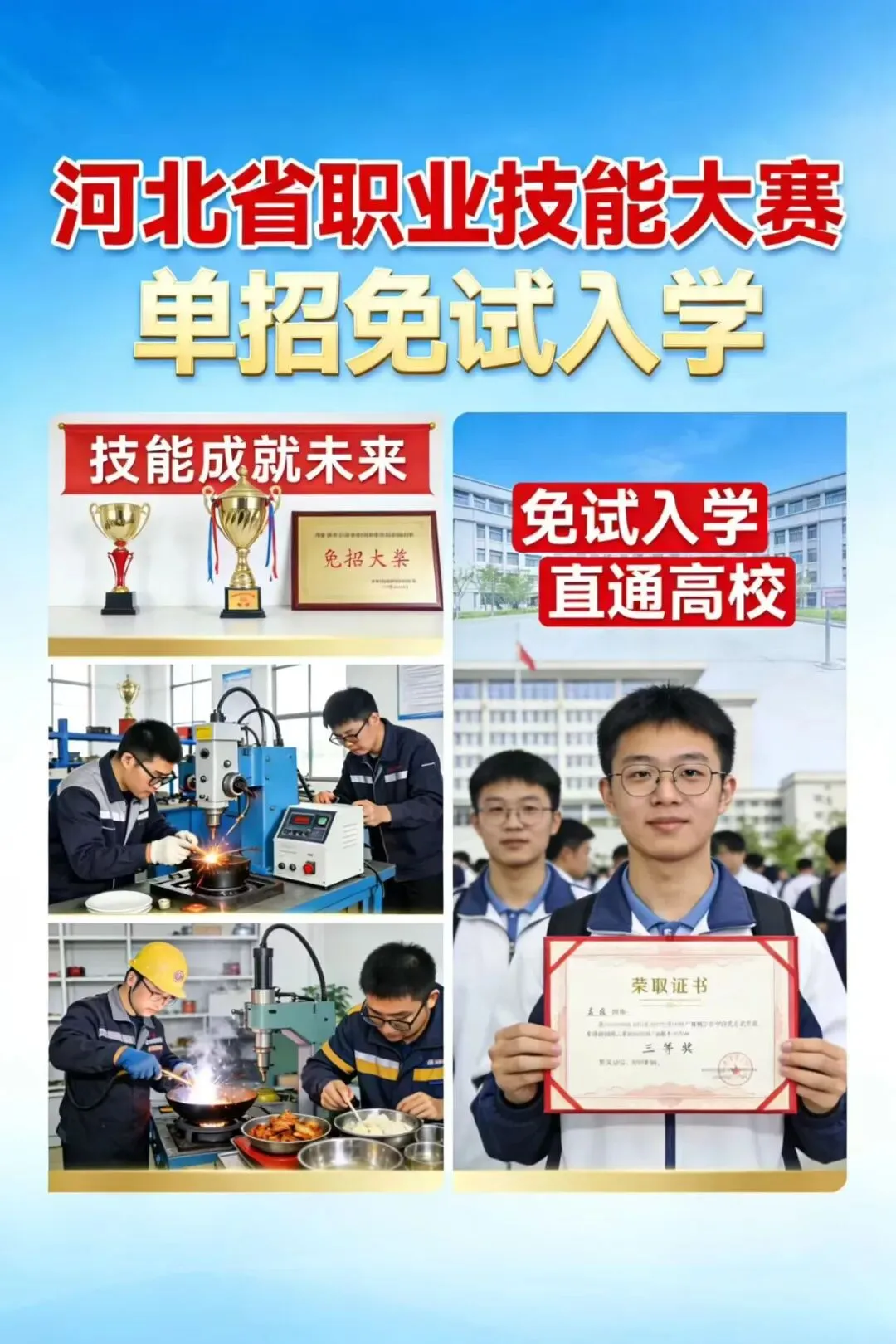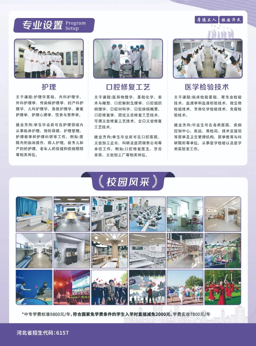 针对年满15周岁的学生,不限户籍,应届往届初中生均可报名。 收费标准:学费9800元一年,农村户口学费减免2000元,住宿费一年1500元独立卫浴宿舍,教材三年1200元。 在校就读的中专生,可以参加河北省对口升学考试、河北省单招考试,升入到河北省内大专院校继续深造学业,或者通过学校的免试入学政策升入到河北省内公办大专院校继续就读完成学业,学校免试入学升学率100%。△庆祝抗战胜利80周年