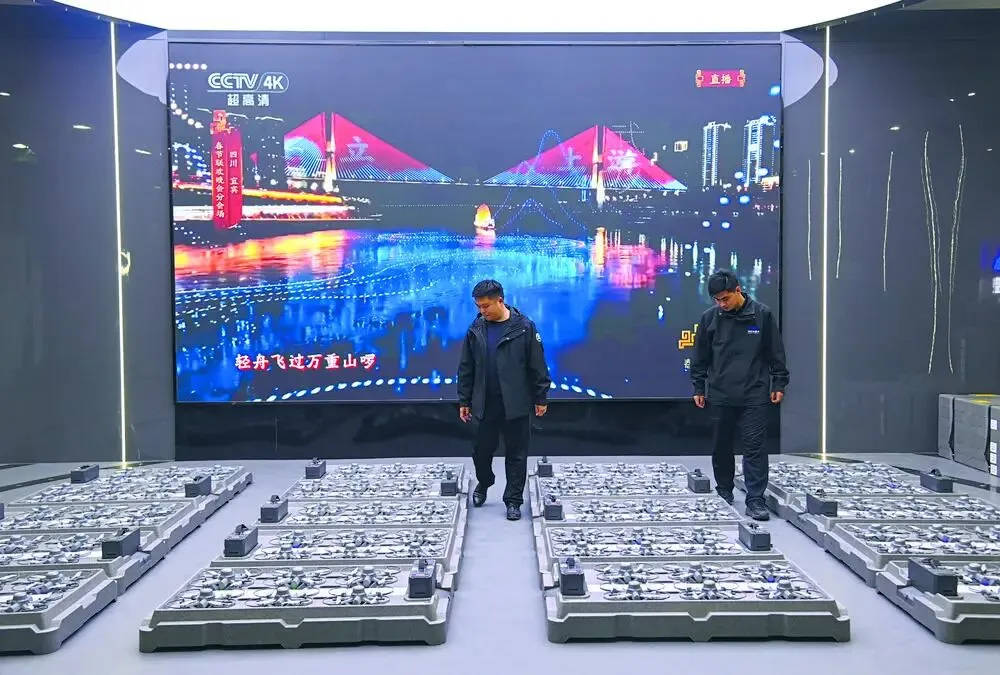 4月3日,河北大漠大无人机应用科技有限公司的工作人员对表演用无人机运行状态进行检查调试。背景电子大屏画面为该公司无人机参与春节联欢晚会四川宜宾分会场的表演场景。