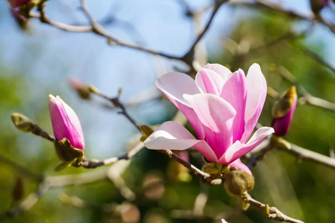 园内园林景致与迎春花、玉兰花、桃花相映成趣,亭台流水间尽展春日芳华。