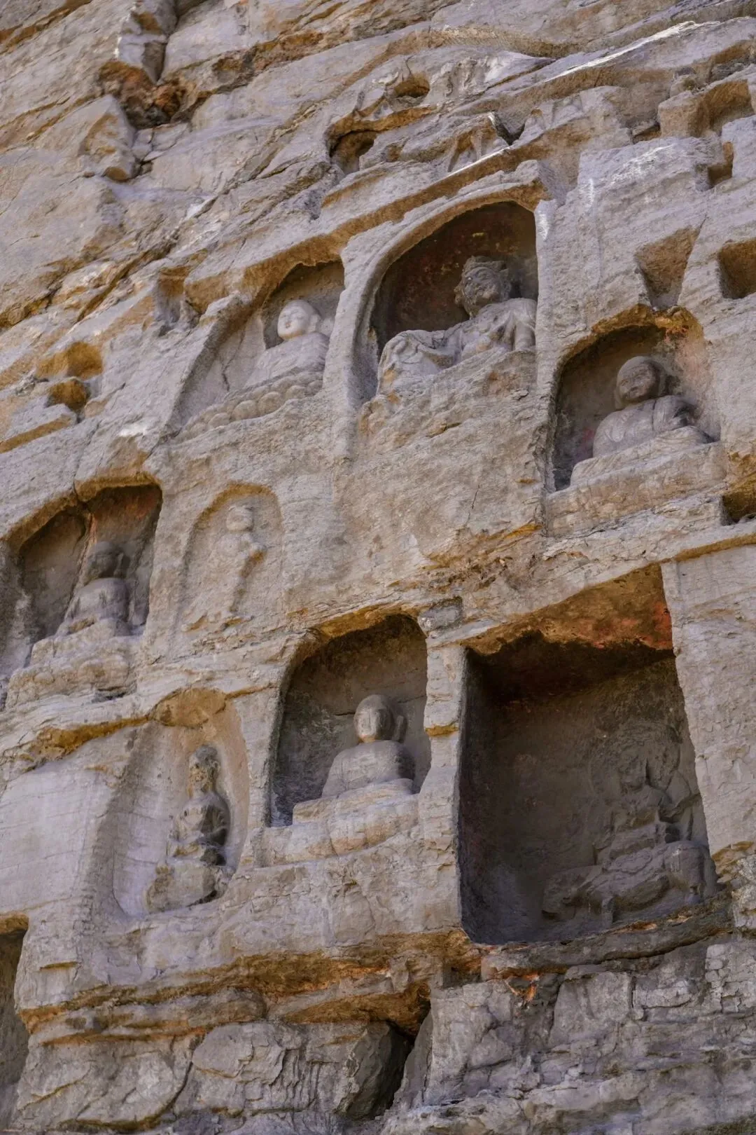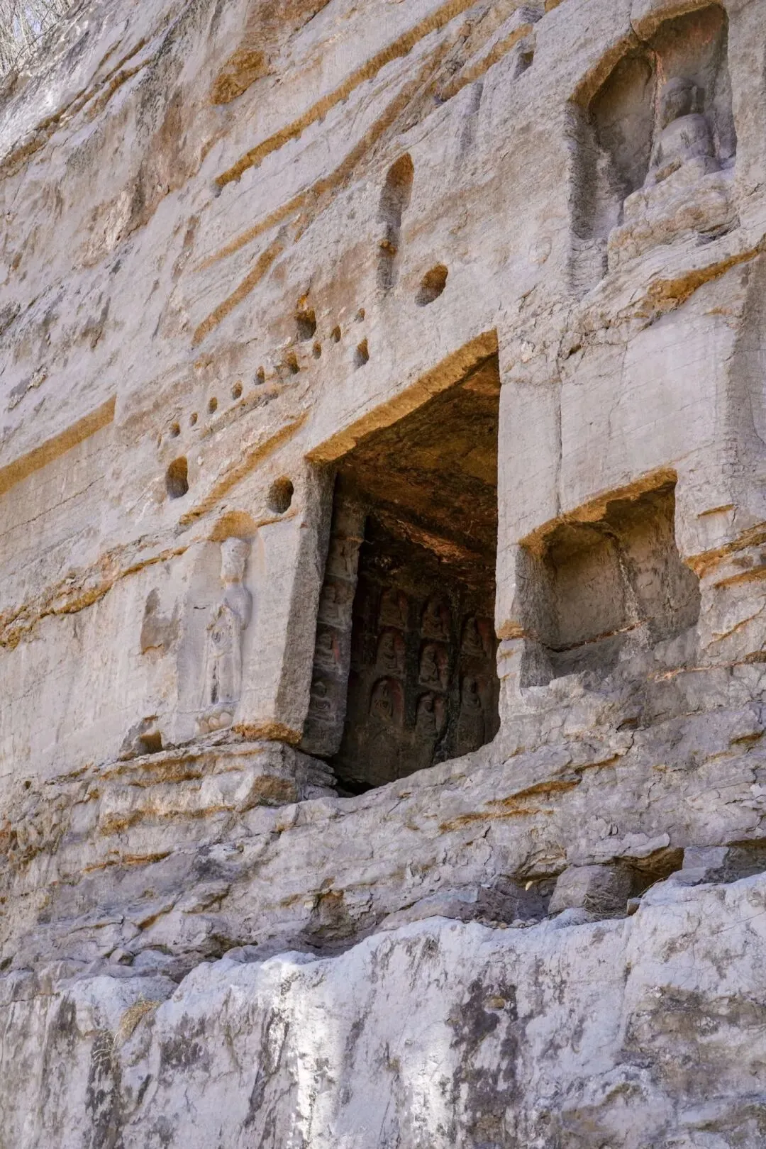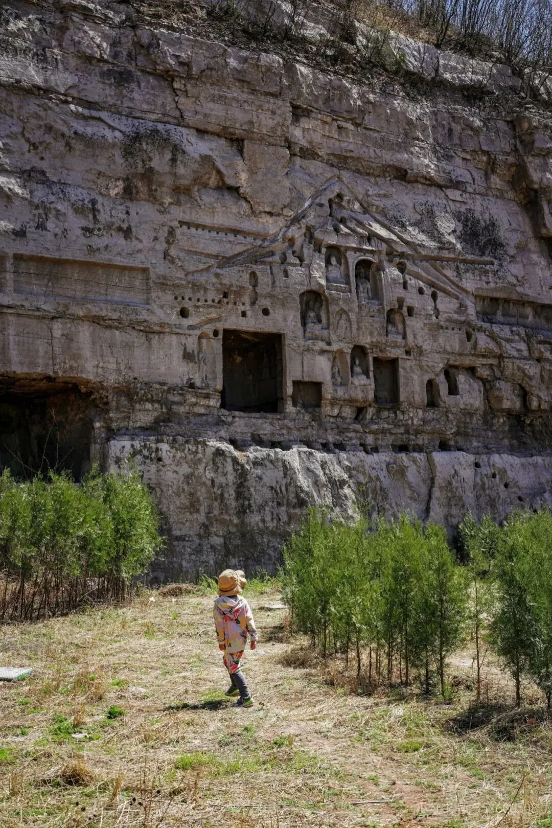 也是在这个春秋背景的游戏里,从小长在太行山脚下的我第一次认全了太行八陉,继而惊讶的发现离我们很近的那个灰头土脸的井陉,就是故事里的古陉之一,而千百年来它竟然从未更名。那之后求着父亲带我走了次从东土门西土门到白皮关东天门的古驿路,踏上古石阶的那刻虚拟和现实交错重叠起宏壮的千年时光,那种心灵的震撼强大无声,像一曲悲歌闷在胸膛中反复地碰撞激荡。井陉,是一个可以穿越时光对话历史的窗口。这一次来对话的,是位于大龙窝村和小龙窝村之间、307国道边仅残存一面摩崖石刻的龙窝寺石窟。没有路标提示,石窟就那样乍然出现在一个转弯后,距离公路不过十米。龙窝寺没有明确史料记载建于何年,依据现有的建筑特色推测大约建于唐末宋初。现保留有47尊佛像,14个石龛。