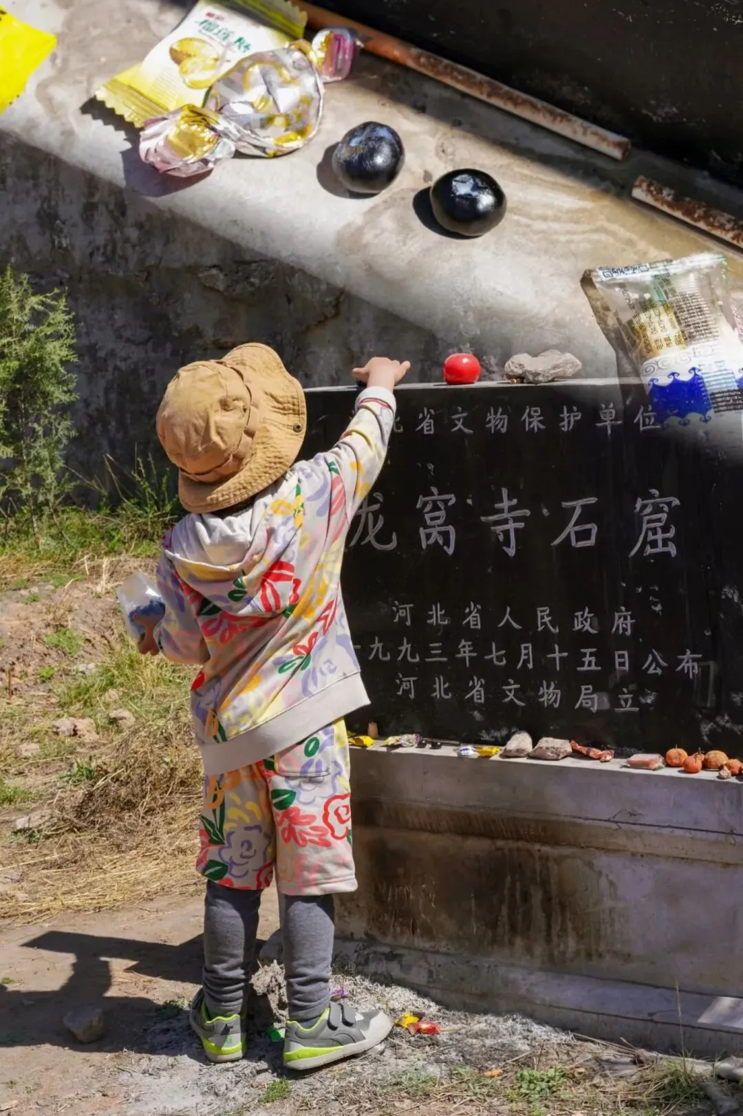 没有香炉,人们就把香火燃在文物保护碑下,碑沿上有各种供奉的小零食水果甚至石头,小朋友也送上了自己的蓝莓,谢谢保佑这一方平安,菩萨们辛苦了。