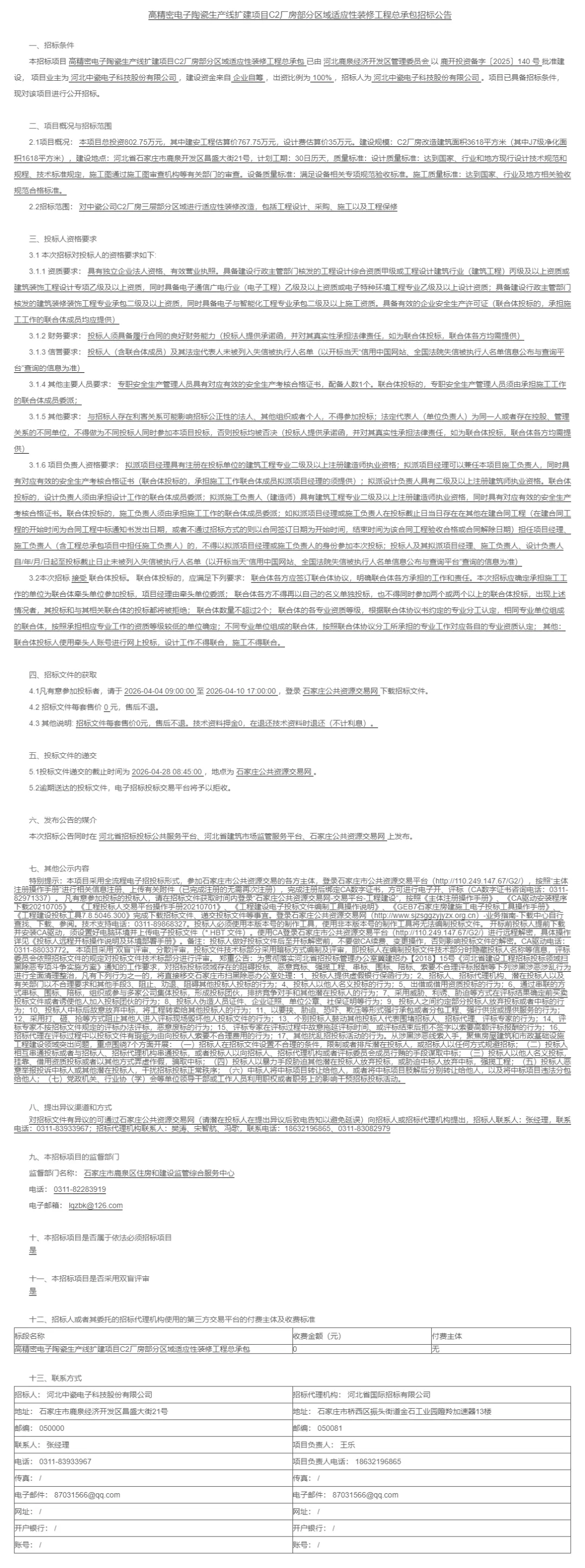 冀工提示:这个项目地点为鹿泉区,总预算为802.75万元,甲方为河北中瓷电子科技股份有限公司,资金来源为企业自筹。