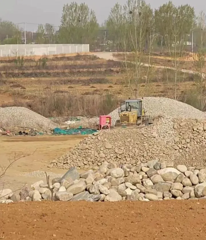 从现场画面可见,厂区内大量砂石原料直接露天堆放,无任何苫盖、围挡措施,料堆裸露在外。推土机在料堆间作业,整个过程无喷淋、抑尘设备,极易产生扬尘污染,对周边大气环境造成直接影响。厂区周边紧邻农田与村庄,无有效隔离防护,粉尘扩散将直接影响周边居民生活与农田环境。
