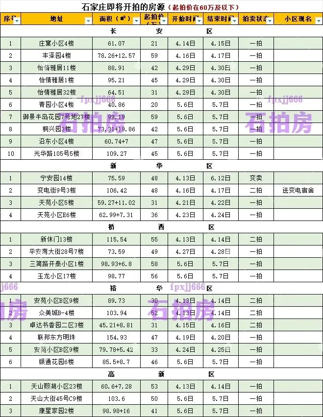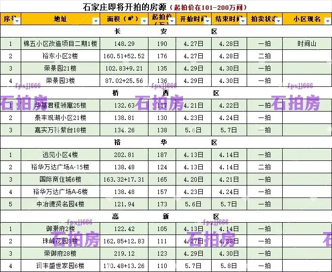 石家庄主城五区即将开拍房源(据区域、起拍价划分)