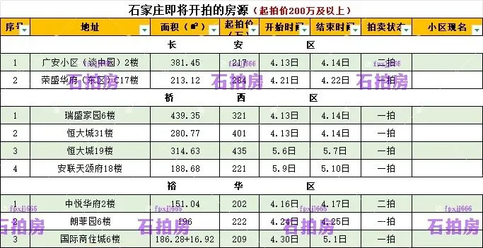 >石家庄主城五区即将开拍房源(据区域、起拍价划分)