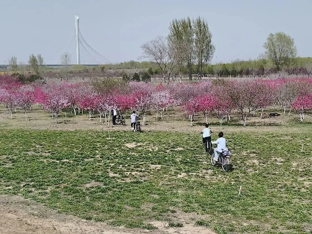 北行不是太远赶上道路维修,只能换路绕行。不知是有意为之,还是疏忽大意,绕行的路没有明显的标识,我们偶然骑行进入了一个小村落。村路两旁都是树林,那些高到的灌木还没有展现新绿,零散的分布着几棵桃树已经盛开,给光秃秃的灌木林中增添了别样趣味,麦田旁边的一排排桃树,在绿油油的麦子的映衬下娇艳欲滴,真不知道是绿油油的麦子映衬了粉红的桃花,还是粉红的桃花点缀了绿油油的麦子,也许是相互成就吧。穿过一段土路后,竟然进入了太平河沿岸的一条路,突然间路下边的一大片桃花林映入眼帘,桃花林如诗如画,远处看宛如一片粉色云霞,孩子们骑着车冲下斜坡,闯进桃花林,微风拂过枝头,粉嫩的花瓣在空中飘舞,淡淡的清香沁人心脾,真让人如痴如醉。