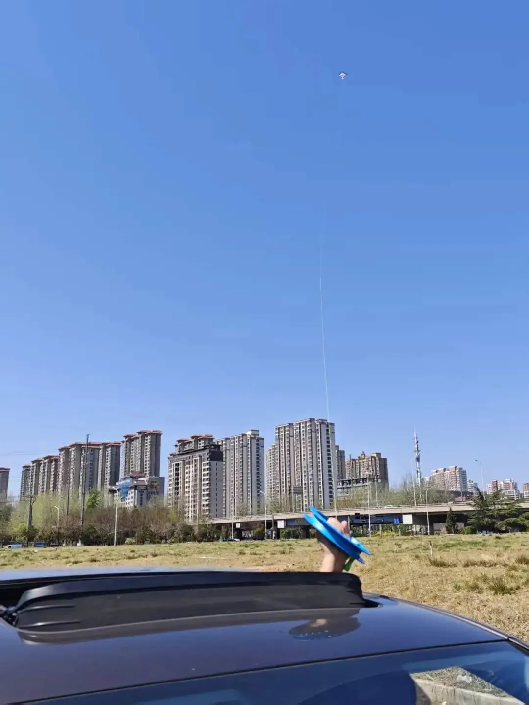 今天没带板凳椅子,由于这块十分空旷,最后回到车里坐着放风筝了,还能用车载音箱听会歌,很是惬意。