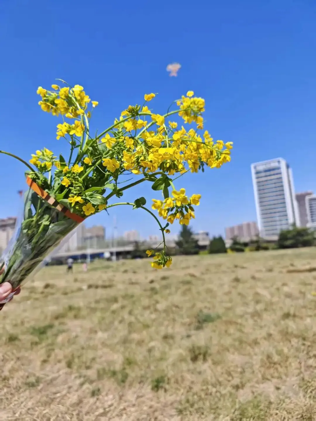距离这不远的地方有观辰公园,那边有很多油菜花,刚好搞活动,我们领了一束,在蓝天映衬下很好看~