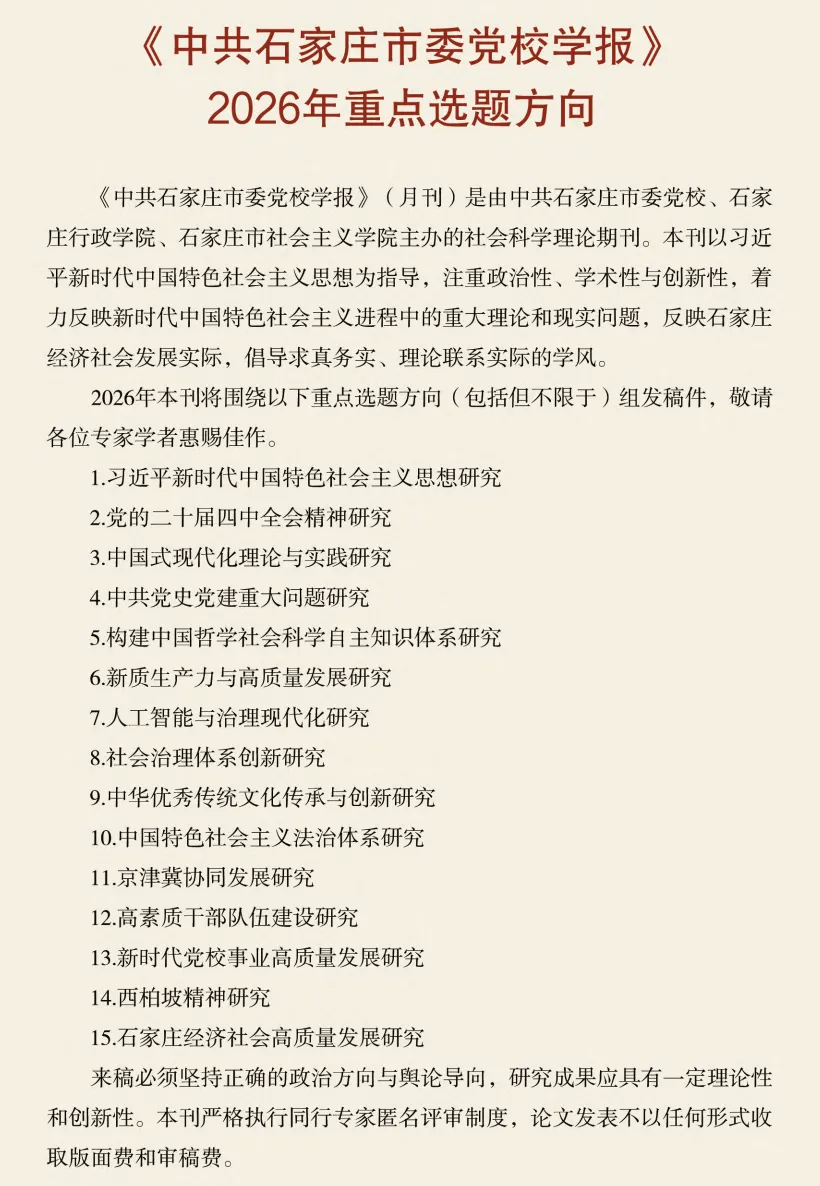 >《中共石家庄市委党校学报》2026年重点选题方向