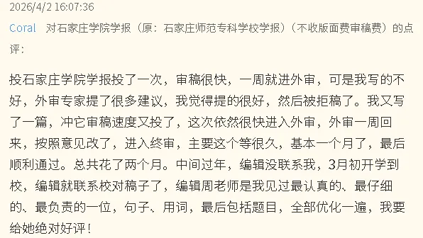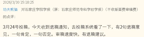 多位作者反馈,该刊审稿效率极高。有作者分享:“投石家庄学院学报投了一次,审稿很快,一周就进外审。”也有作者反馈“5天退稿”“14天退稿”,不拖泥带水,不耽误作者时间。