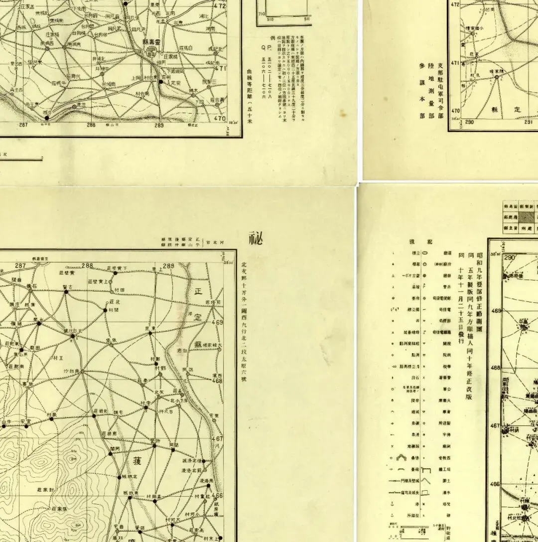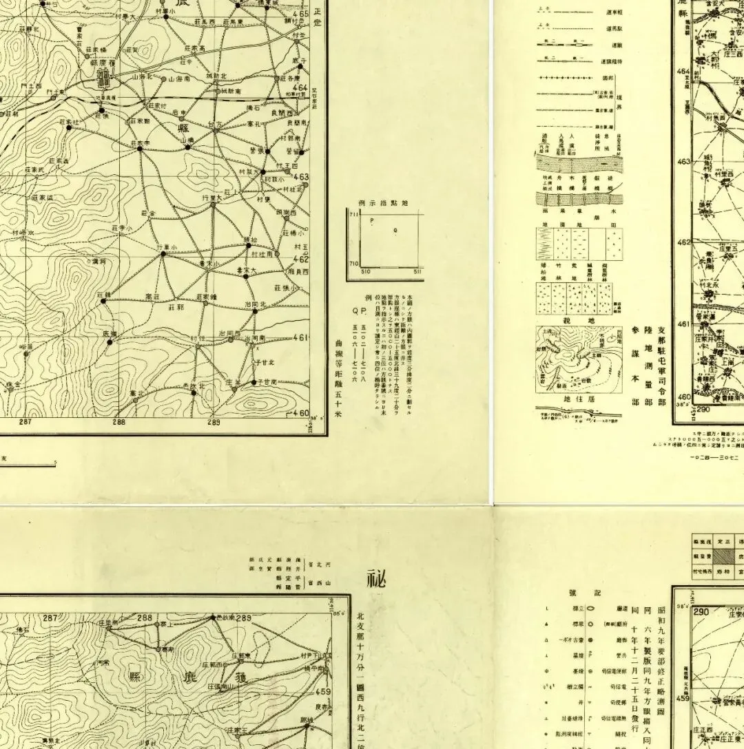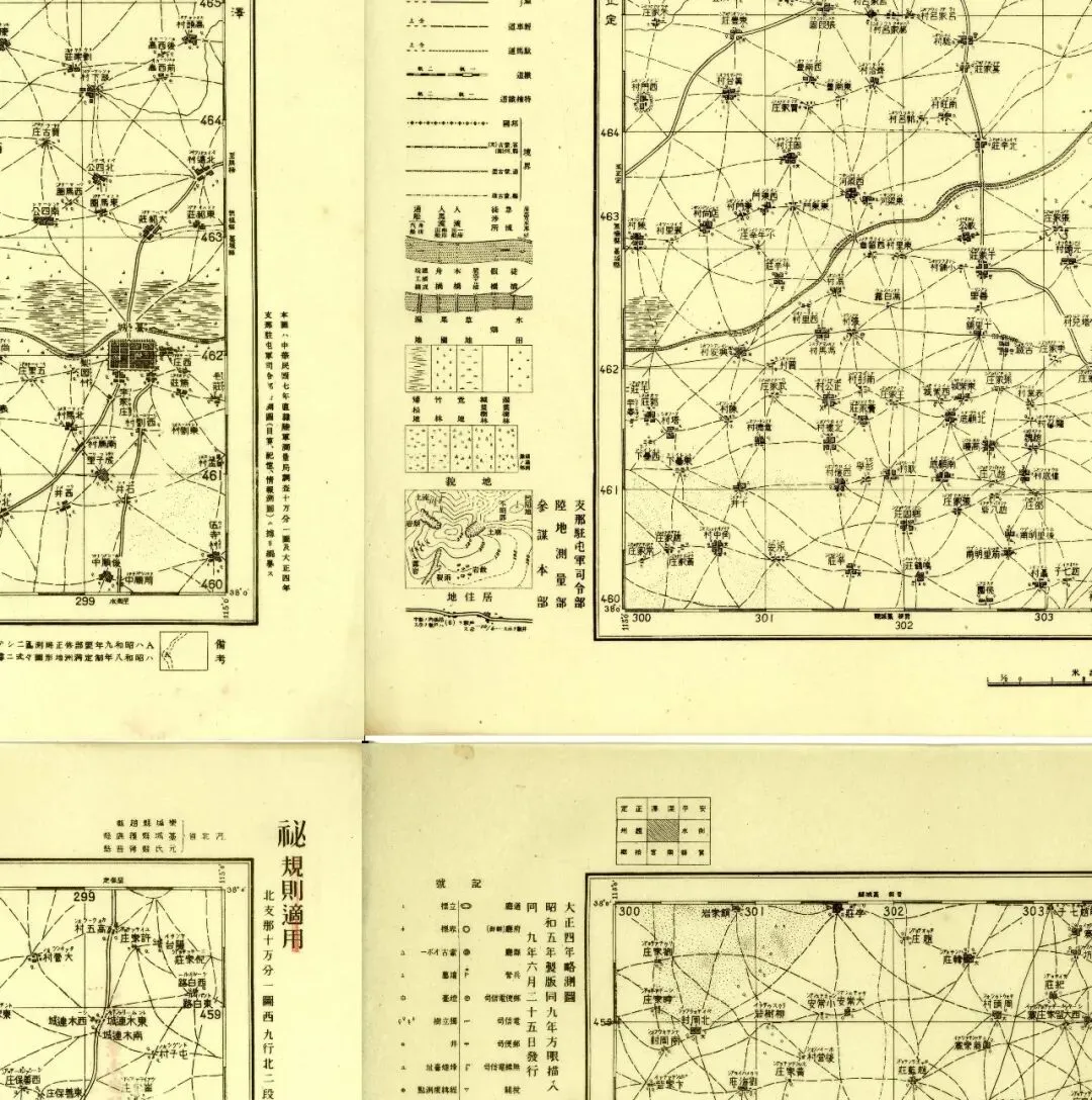 九张地图中,五张在外图廓的左侧带有图例说明,机构为侵华日军的中国驻屯军司令部,另外四张则没有,为陆地测量部。