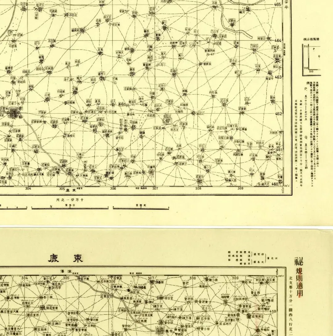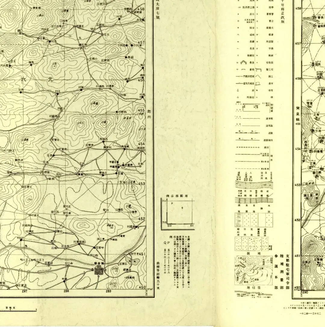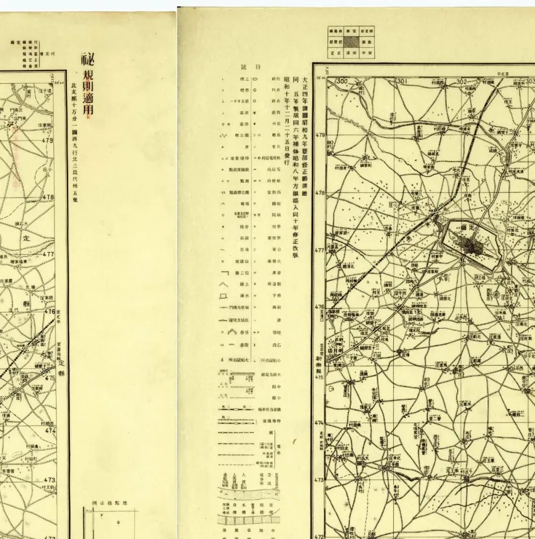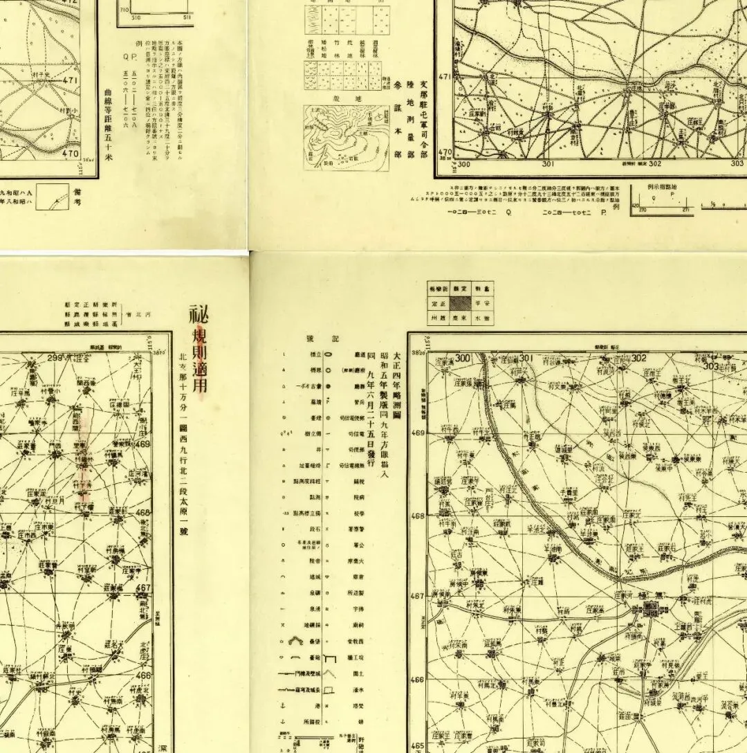九张地图中,五张在外图廓的左侧带有图例说明,机构为侵华日军的中国驻屯军司令部,另外四张则没有,为陆地测量部。