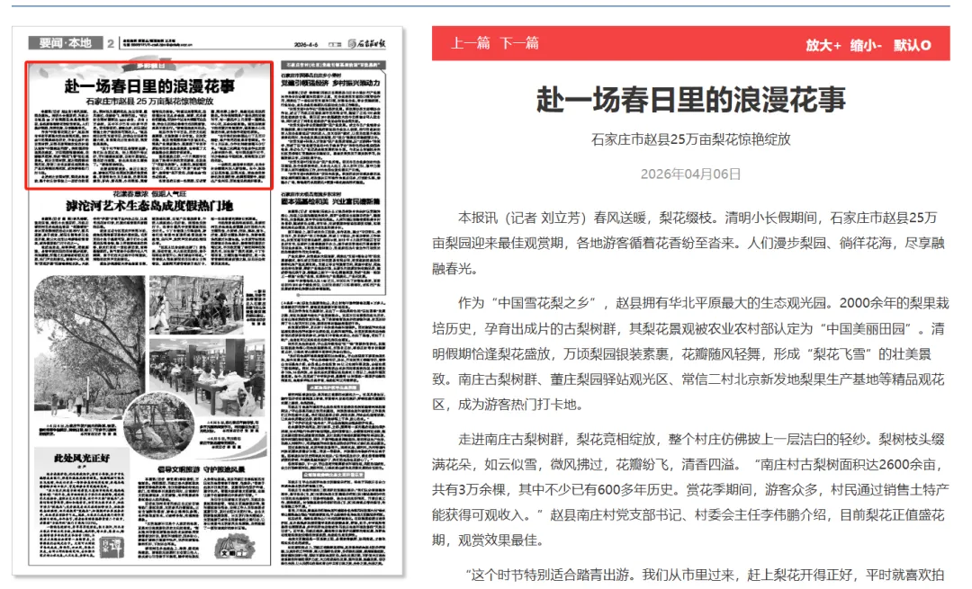 一朵梨花,激活春日经济,也为乡村全面振兴注入新动能。如今,赵县正以花为媒、以梨兴业,将生态优势转化为发展优势,在满园梨雪中,绽放出产业兴旺、百姓富足的美好图景。