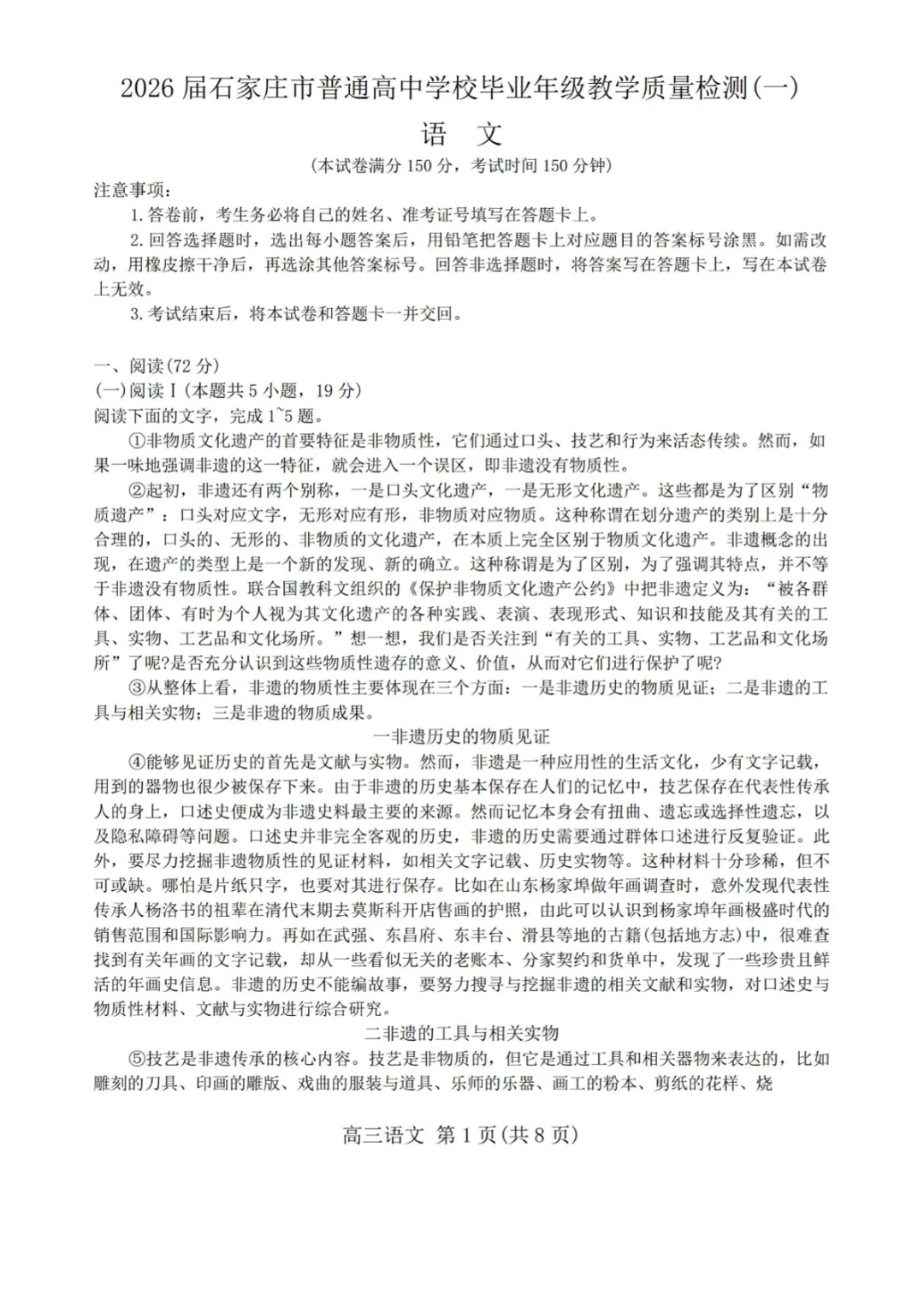 【石家庄一模】石家庄市2026届高三年级教学质量检测(一)及参考答案,考点全面、难度适中,助力考生精准定位复习短板。