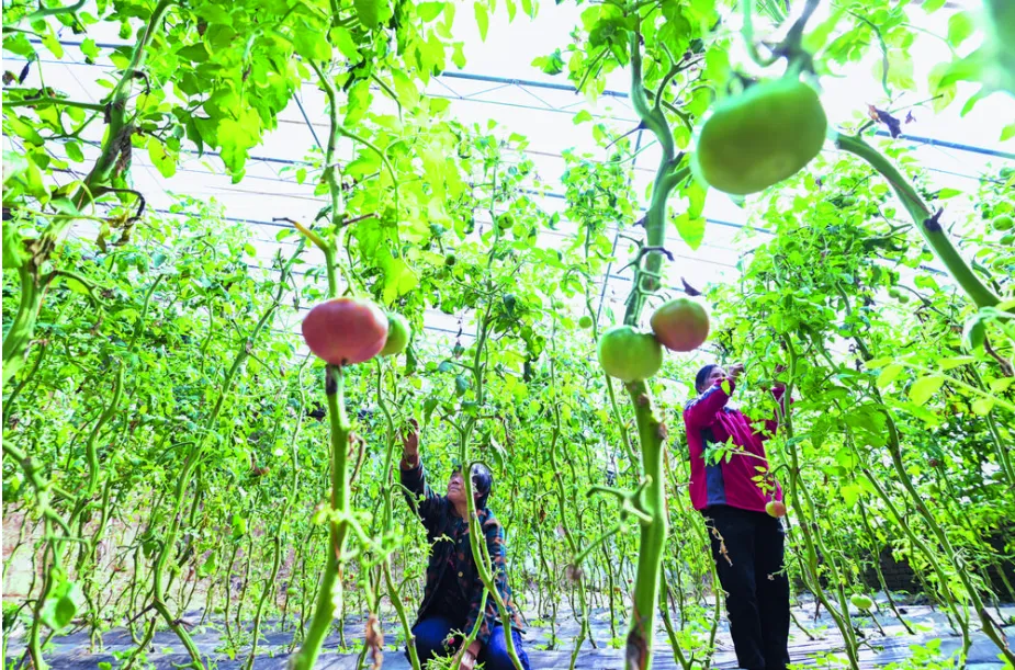 灵寿县三圣院乡西木佛村村民在木佛庄园现代农业大棚里管护西红柿