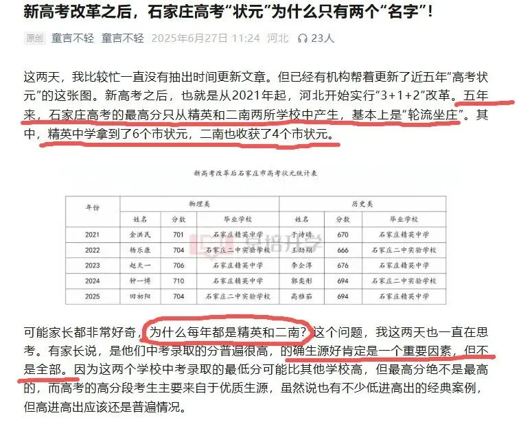 石家庄二中基本垄断了全市的尖子生,为什么5年了一个市状元都培养不出来?