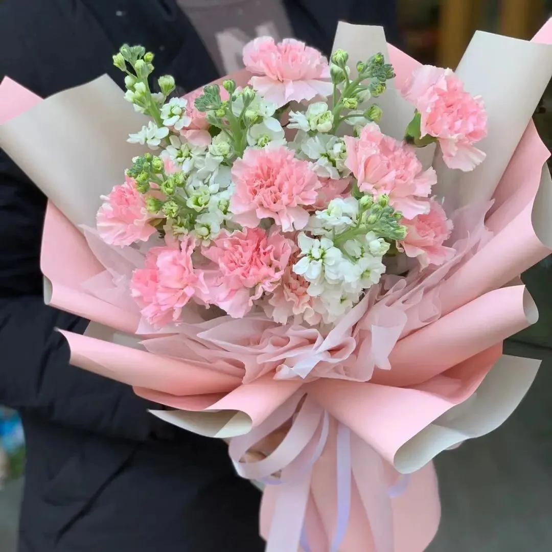 康乃馨是送父母、长辈和老师的首选鲜花,代表尊敬和祝福。康乃馨可以搭配百合,也可以搭配玫瑰,还可以搭配向日葵,每一种搭配都很不错哦。