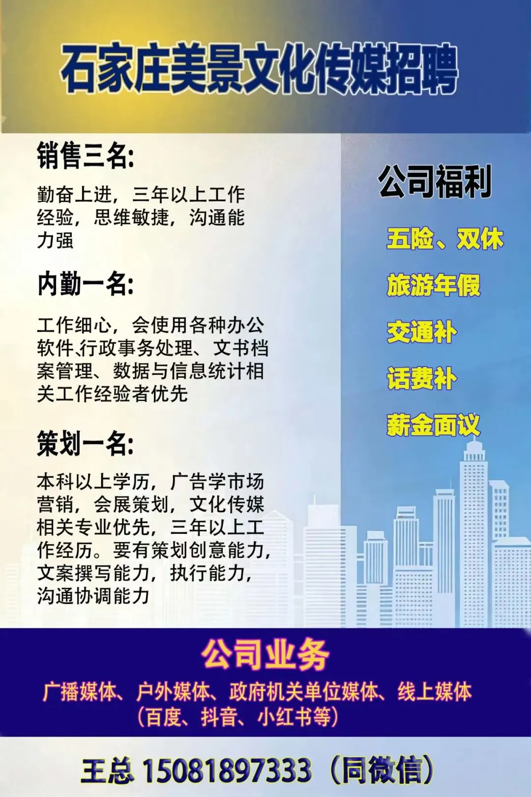 石家庄美景文化传媒有限公司长期服务于广播媒体、户外媒体、政府机关单位媒体及百度、抖音、小红书等线上平台。为满足业务发展需要,现面向社会公开招聘三类岗位人员。