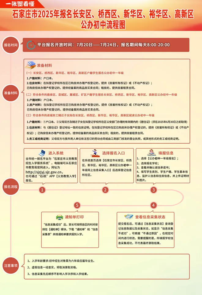 注册登录:用常用手机号注册,双胞胎需分别注册,妥善保管账号。选择入口:按区域选择 “公办初中一年级网上信息采集”。填报信息:填写学生与监护人基本信息、户籍、房产 / 居住信息,地址与证件一致。状态查询:在系统首页查看审核结果,未通过及时补正。打印通知:审核通过后,打印《入学信息表》与通知单。1. 主城区户籍(长安 / 桥西 / 新华 / 裕华 / 高新)