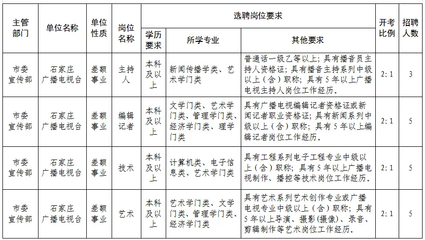 2026年度石家庄广播电视台拟公开选聘事业单位工作人员18名,其中主持人岗位3名、编辑记者岗位5名、技术岗位5名、艺术岗位5名。岗位要求详见《石家庄广播电视台2026年度公开选聘工作人员岗位信息表》(附件1)。
