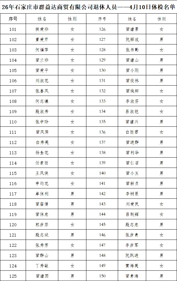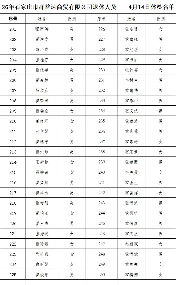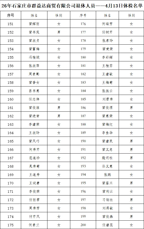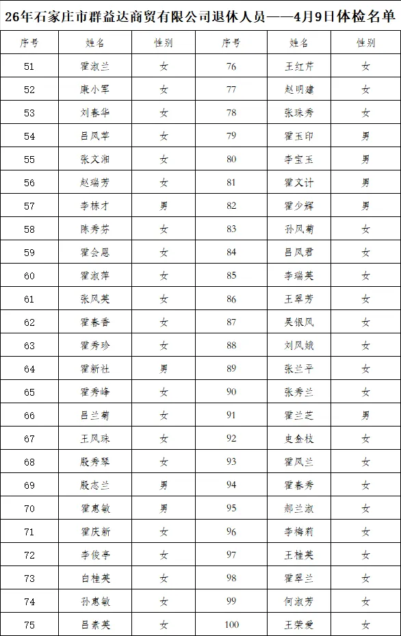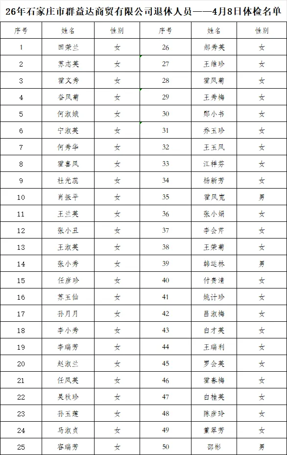 下附体检名单。 2026年4月7日
