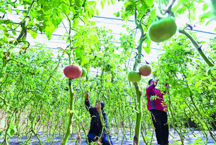 灵寿县三圣院乡西木佛村村民在木佛庄园现代农业大棚里管护西红柿。