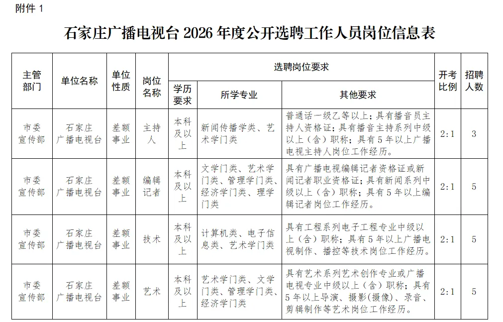 2026年度石家庄广播电视台拟公开选聘事业单位工作人员18名,其中主持人岗位3名、编辑记者岗位5名、技术岗位5名、艺术岗位5名。岗位要求详见《石家庄广播电视台2026年度公开选聘工作人员岗位信息表》(附件1)。