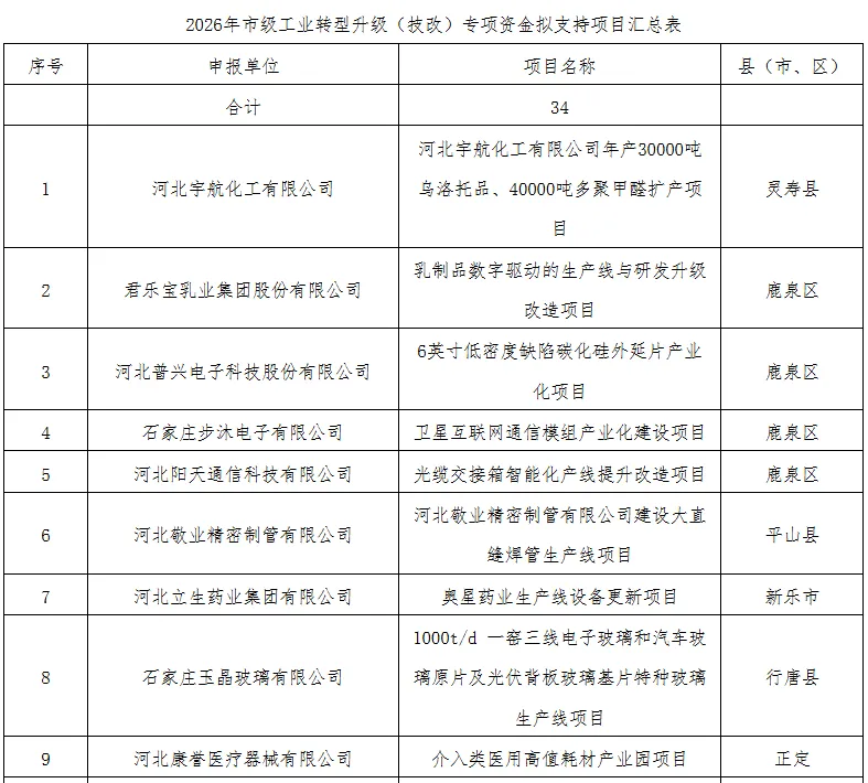 【石家庄市】2026年市级工业转型升级(技改)专项资金项目公示