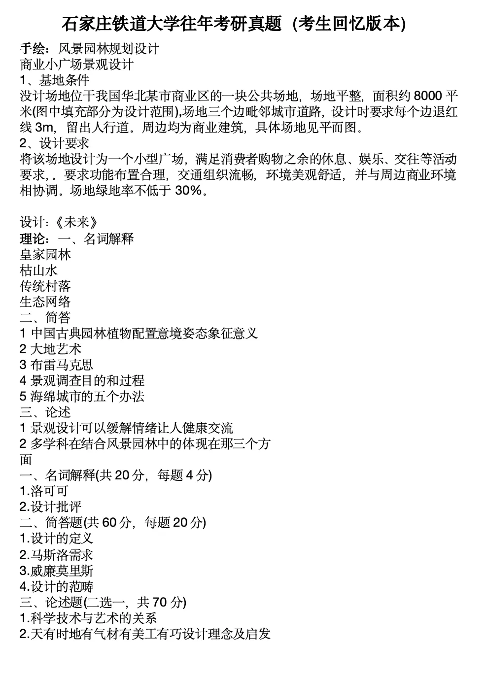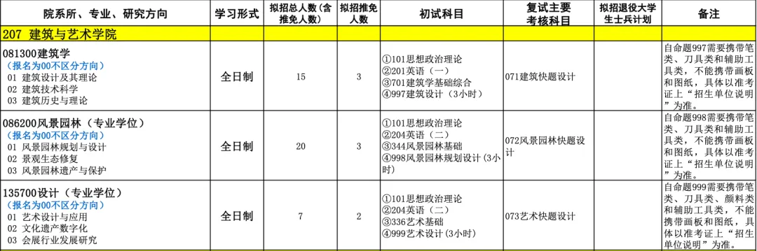 3.特殊要求:初试期间,参加997建筑设计(3小时)、998风景园林规划设计(3小时)和999艺术设计(3小时)自命题科目考试的考生需要携带笔类、刀具类、颜料类和辅助工具类,不能携带画板和图纸,图纸将由我校在试题袋中提供(不用考点答题纸),具体以准考证上“招生单位说明”为准;其余自命题科目只能携带常规文具(不含计算器),且铅笔作答无效,如有其他特殊要求以准考证上“招生单位说明”为准。