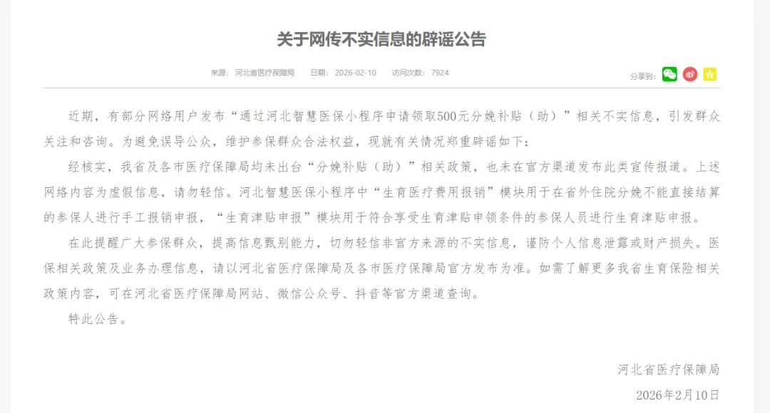 ⚠️ 温馨提醒:请勿轻信“500元分娩补贴”等非官方信息,谨防诈骗。所有政策请以“河北省医疗保障局”官网或公众号发布为准 。