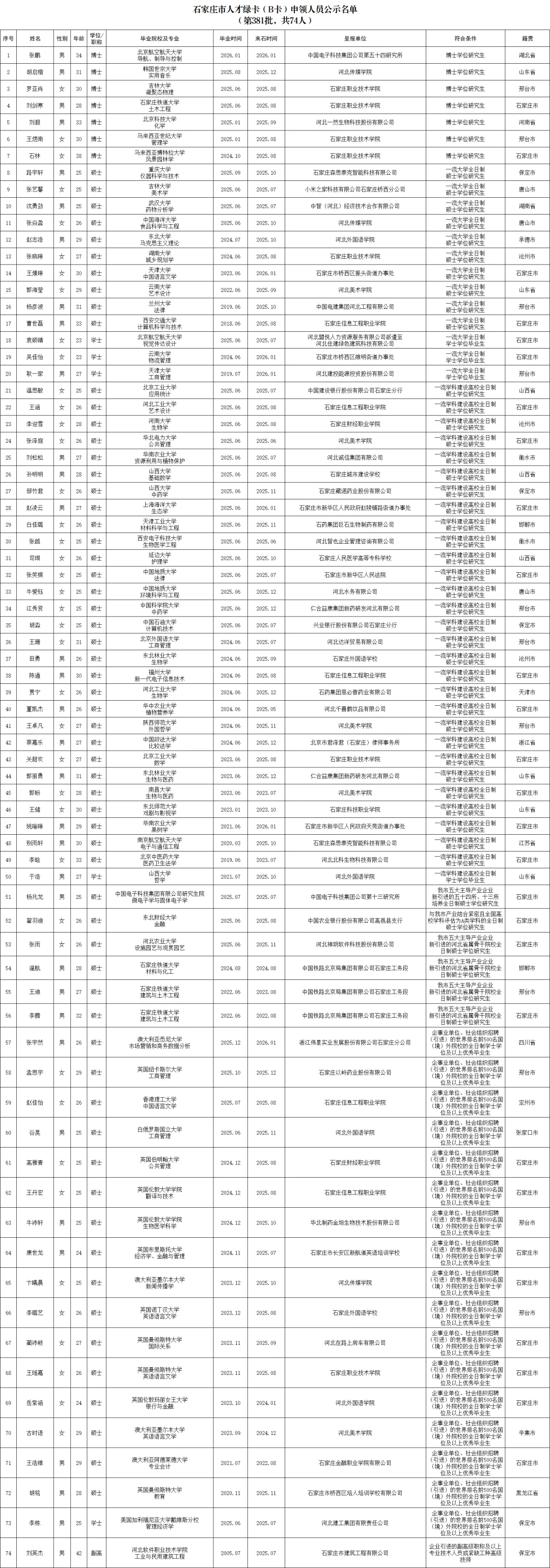 根据《石家庄市人才绿卡(B卡)管理办法(试行)》规定,经过本人申请、网上预审、单位审核、资格复审,拟为张鹏等74名申请对象发放人才绿卡(B卡)。按照有关规定,现予公示,公示期截至2026年4月13日。如有问题请向石家庄市委组织部人才服务中心反映。