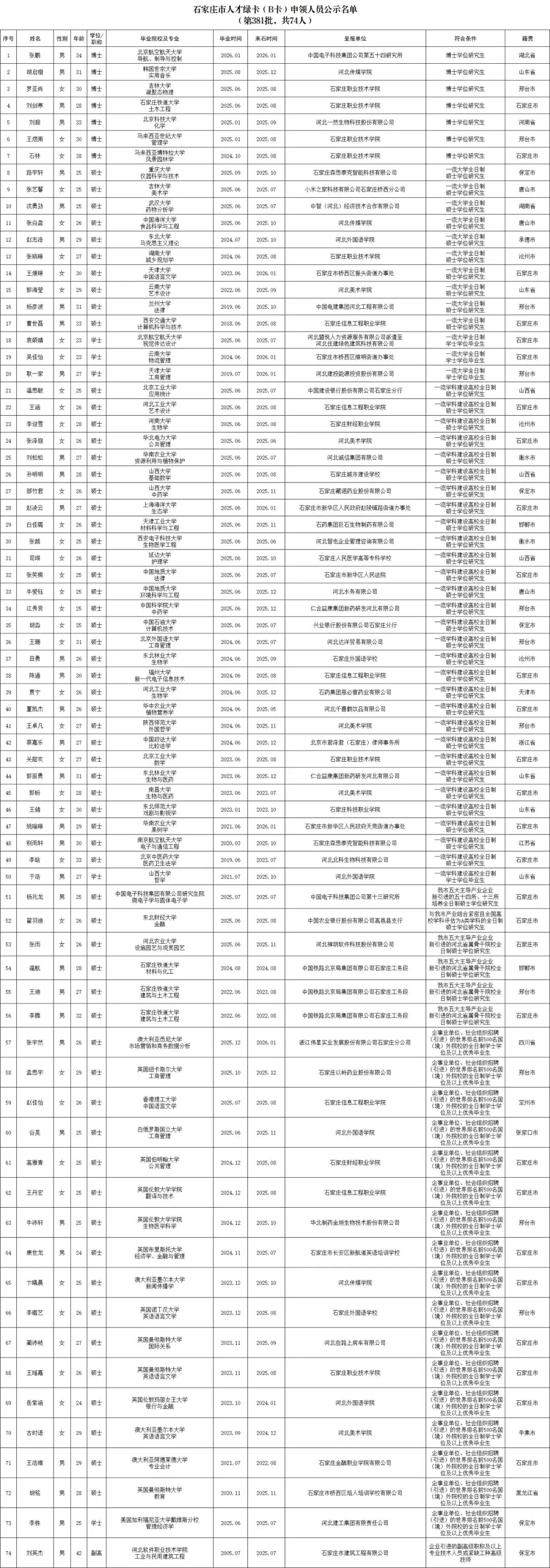 根据《石家庄市人才绿卡(B卡)管理办法(试行)》规定,经过本人申请、网上预审、单位审核、资格复审,拟为申请对象发放人才绿卡(B卡)。