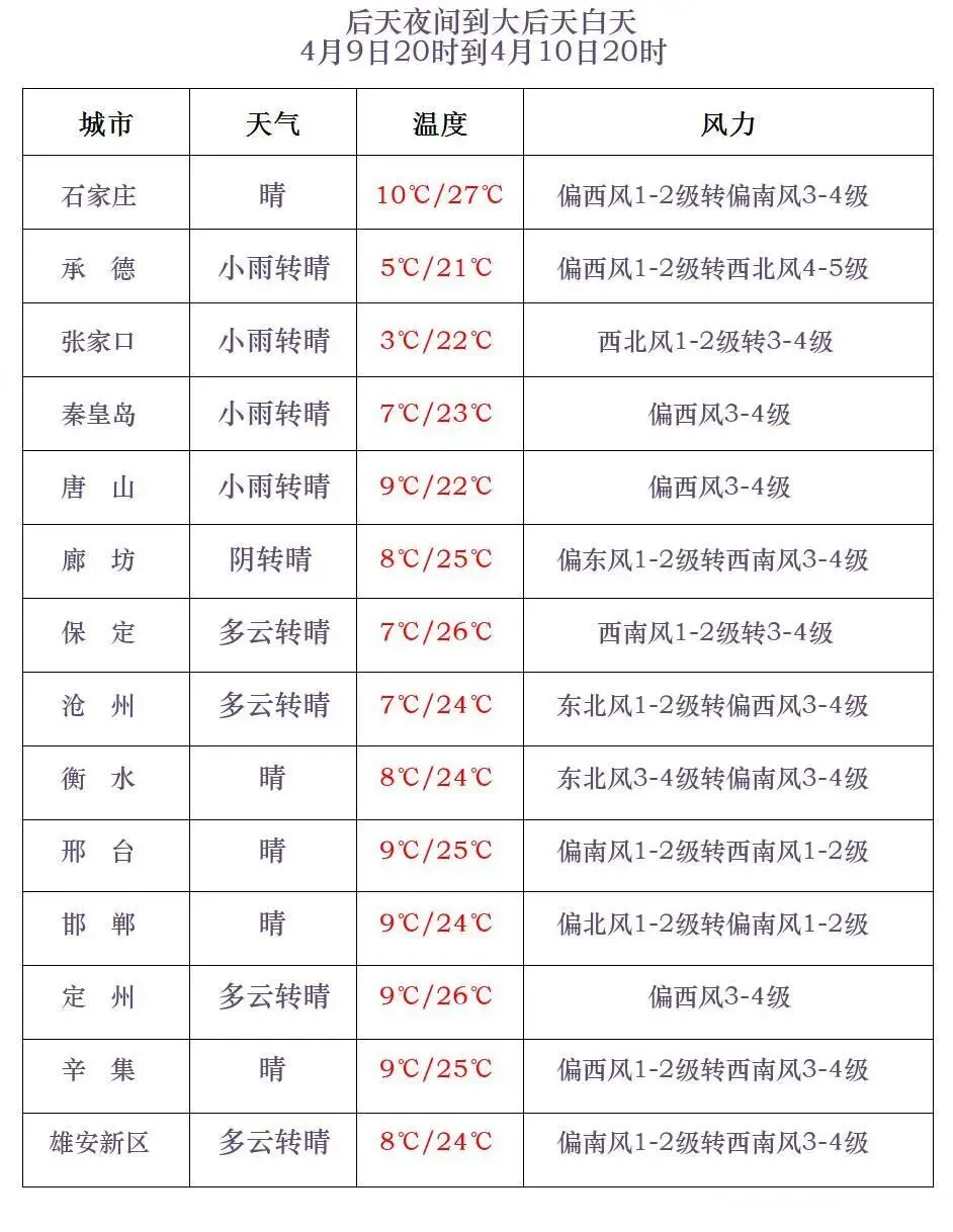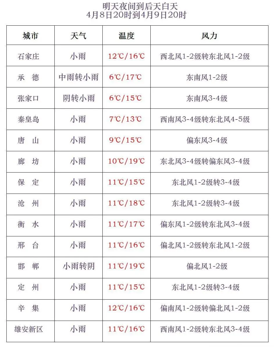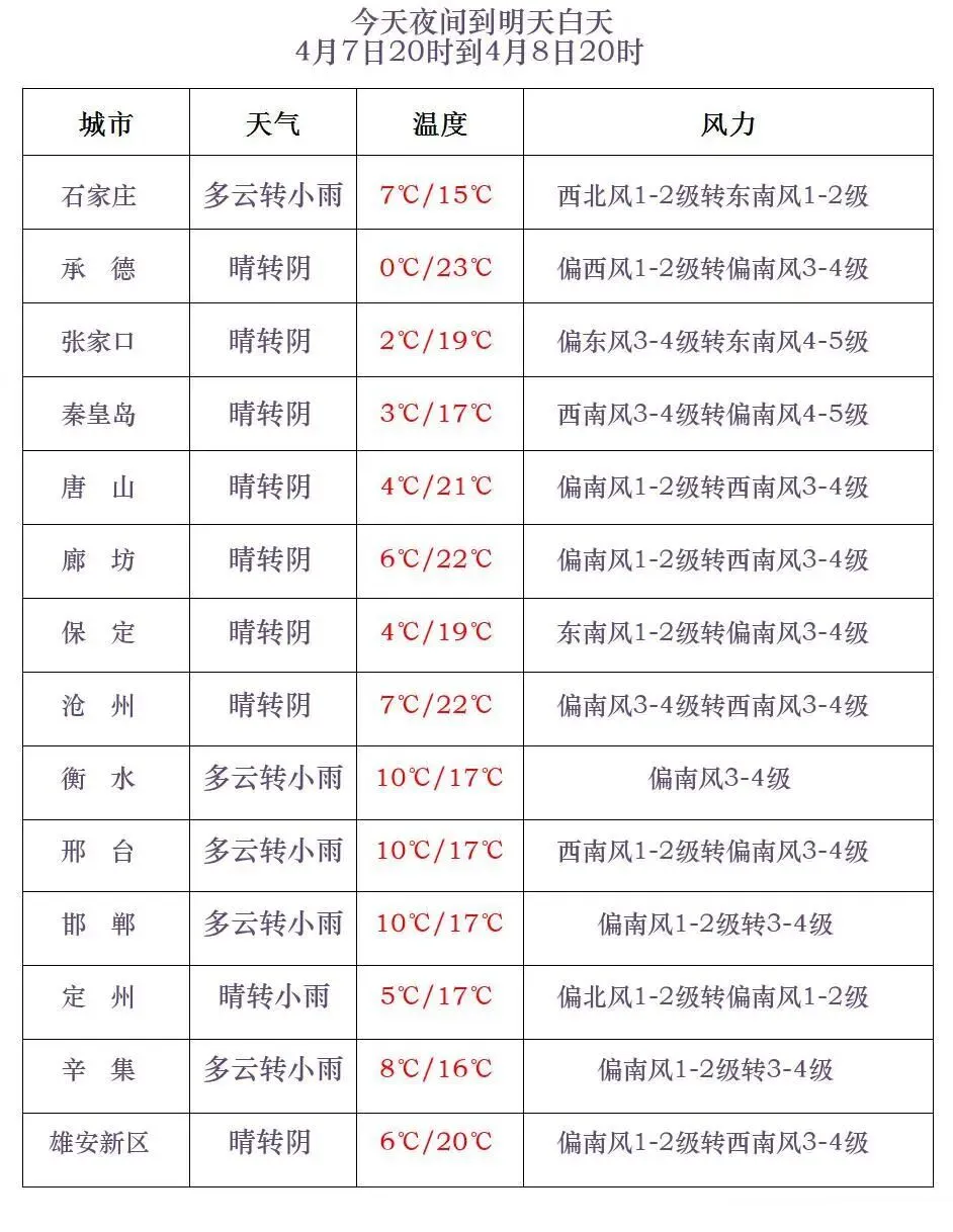 今天傍晚到夜间,石家庄南部、邢台、邯郸晴转多云,其他地区晴间多云。最低气温,张家口东部、承德、秦皇岛北部-4~0℃,其他地区1~11℃。明天白天,全省多云转阴,张家口、承德西部、保定、石家庄、沧州西部、衡水、邢台、邯郸有小雨或零星小雨,其中邯郸局地有中雨。最高气温,全省大部分地区14~23℃。明天夜间到9日,全省阴有小到中雨,其中承德的坝上地区有小雨转雨夹雪。9日夜间到10日,北部和东部地区阴有小雨或零星小雨转晴,其他地区多云转晴。大风