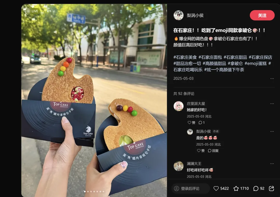 "emoji同款"四个字,就是这条内容的全部武器。一块拿破仑蛋糕,因为长得像🎨调色盘emoji,瞬间有了传播记忆点。视觉锤+社交货币,这是2026年甜品赛道最有效的爆款公式。