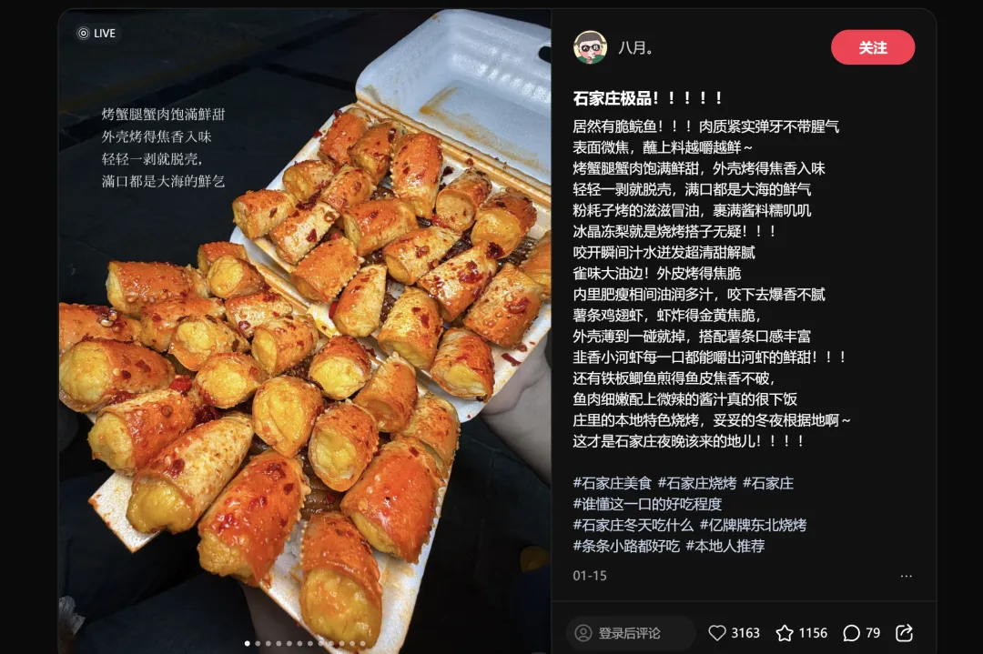 注意这条内容的标题——"石家庄极品!!!!!",五个感叹号,没有任何花哨的文案技巧,纯靠"情绪浓度"取胜。这恰恰说明烧烤品类的传播逻辑和甜品完全不同:甜品卖颜值,烧烤卖体验。
