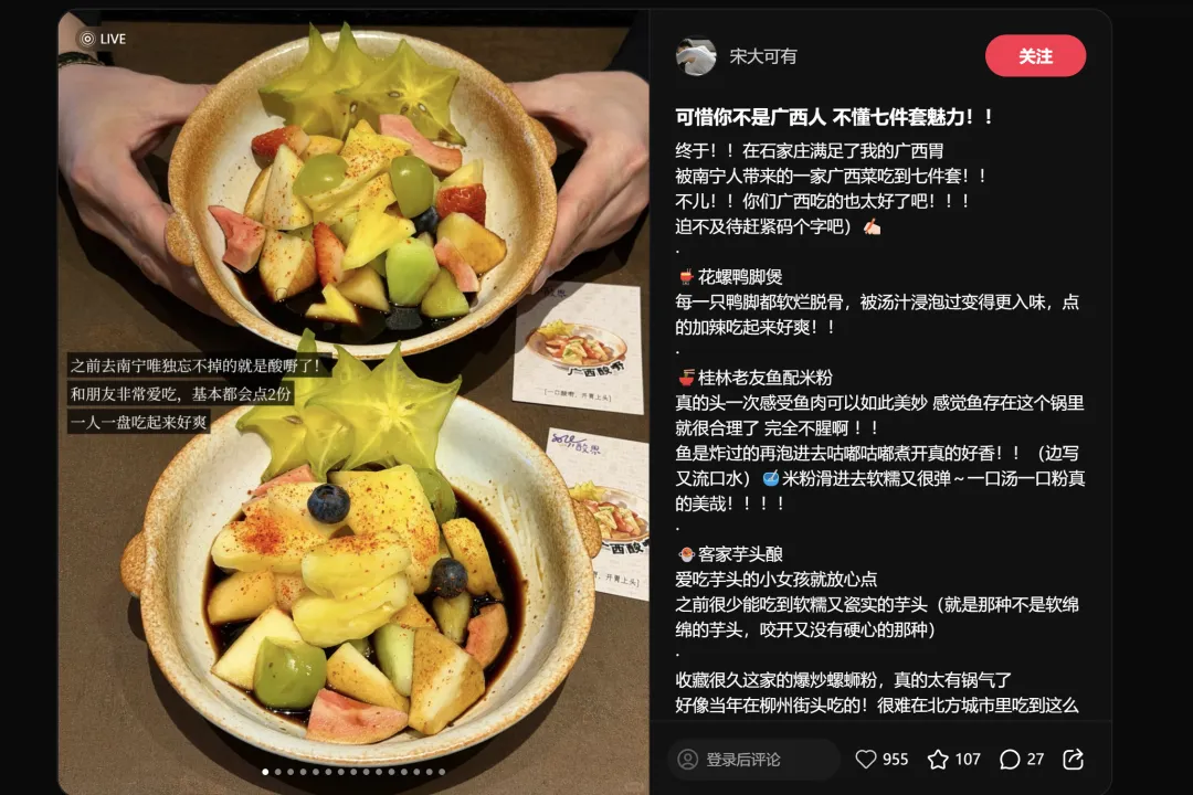 "可惜你不是广西人,不懂七件套魅力"——这条内容用的是地域文化的"挑衅式"表达,制造好奇心缺口。一个广西地方小吃出现在石家庄并拿到近千赞,说明跨区域品类迁移仍然是餐饮创业的有效策略,前提是你能把"地域特色"包装成社交话题。