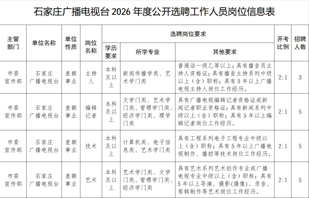 附件:《石家庄广播电视台2026年度公开选聘工作人员岗位信息表》