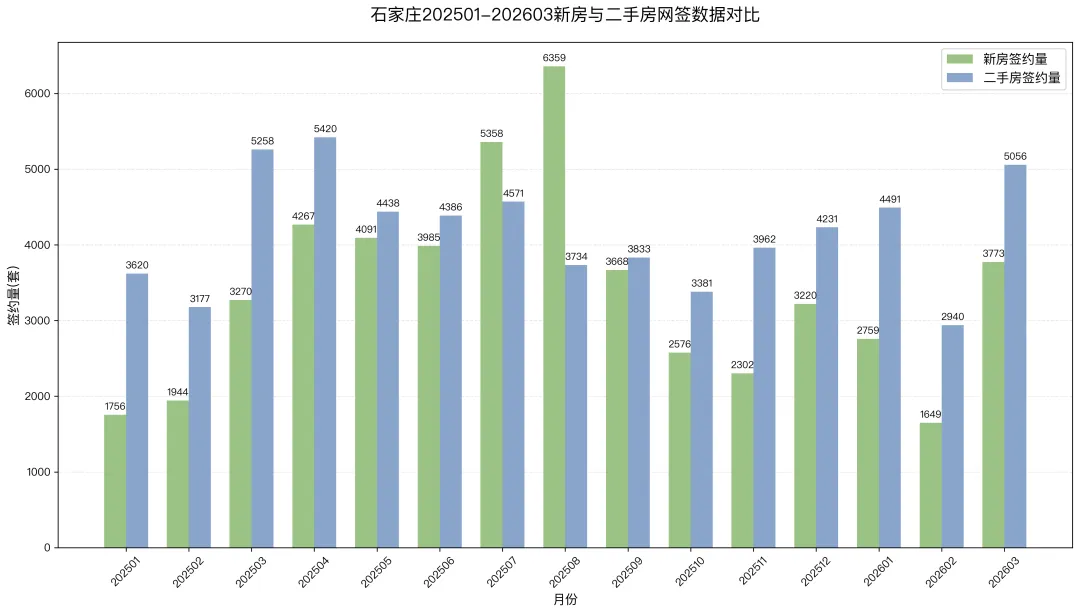 石家庄2025年1月至2026年3月新房及二手房签约数据对比如下:- 环比签约量大涨:3月签约5056套,环比大增2116套(+71.97%);签约面积超47.9万㎡,这属于典型的“节后回暖”效应,显示春节后市场需求集中释放。