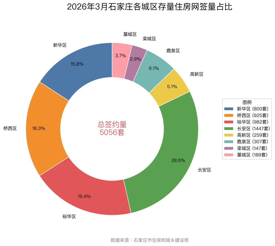 下图为2026年3月石家庄各城区二手房签约占比统计图:2026年3月,石家庄全市存量住房网签总量为5056套。从各城区签约量占比来看,市场呈现出明显的区域分化特征,核心城区(长 安区、桥西区、裕华区)签约4154套,占总量的82.1%,是石家庄二手房市场的绝对主力。外围城区(高新区、鹿泉区、栾城区、藁城区)占比相对较小。