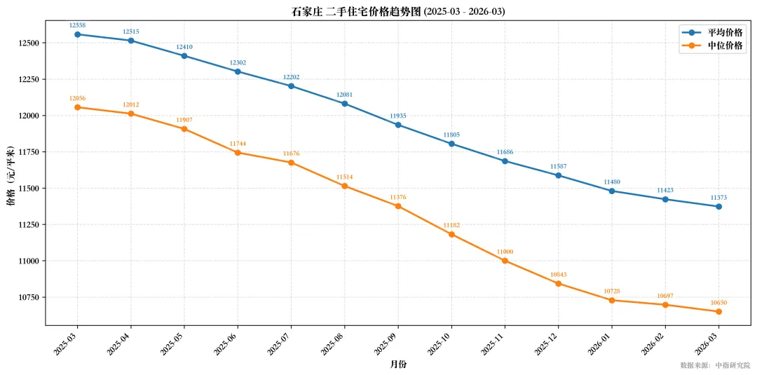 2025年3月至2026年3月期间,石家庄二手住宅市场经历了显著的价格调整,平均价格与中位价格均出现两位数的累计跌幅,反映出市场整体处于调整周期。进入2026年,环比跌幅在一季度有所收窄,显示出市场下行压力有所缓解。对于购房者而言,当前价格具备一定的吸引力;对于业主而言,则需要根据自身情况,合理调整心理预期和定价策略。