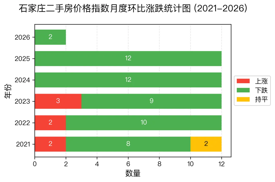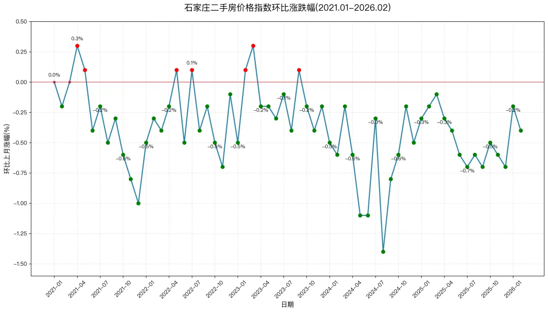下图为2021年1月至2026年2月石家庄二手房价格指数月度环比涨跌幅趋势图,基于国家统计局70个大中城市二手住宅销售价格指数据整理制作,相对更具权威性。其中2021年4月环比涨幅最大(0.3%);2024年8月跌幅最大,跌幅达 1.4%。截至2026年2月石家庄二手房价格自2023年10月份已连续 29个月呈下跌走势。2026年2月石家庄二手房价格指数,环比上月(26年1月)下降 0.4%,同比较上年同月下降 5.4%。