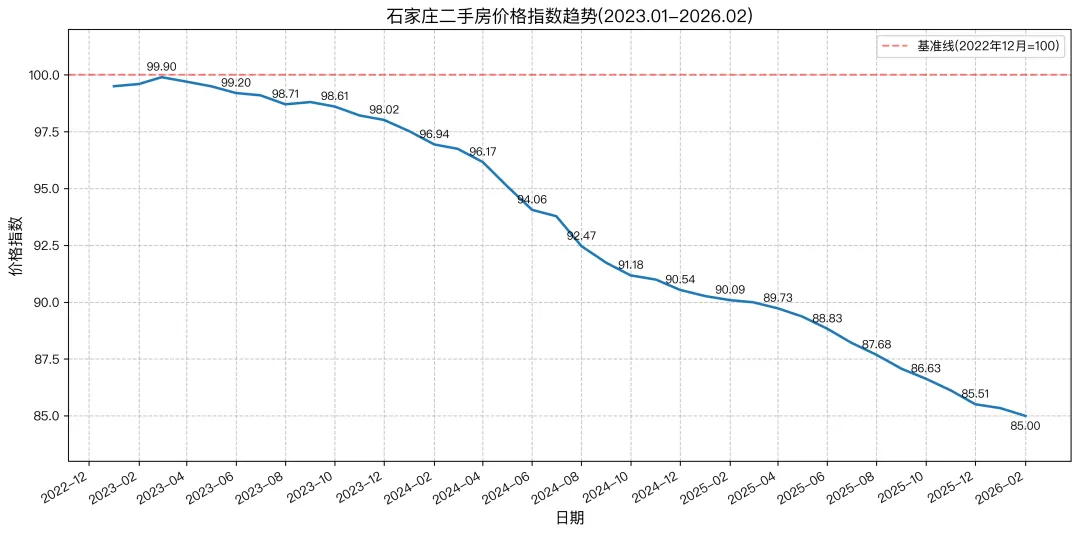 以2022年12月价格为基准(100),2023年1月至2026年2月石家庄二手房市场价格变化走势如下图所示:自2023年1月至2026年2月,石家庄二手房市场价格指数呈现持续下行态势,从基期的100下降至期末的85,累计跌幅达15.0%,期间未见明显反弹,市场整体处于长期调整与降温通道。若未来无强有力政策刺激或市场信心修复机制介入,短期内价格或继续在低位震荡,不排除进一步小幅下跌的可能。