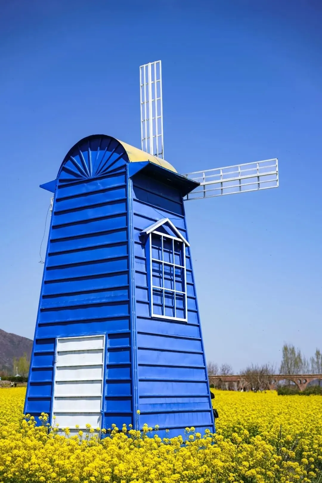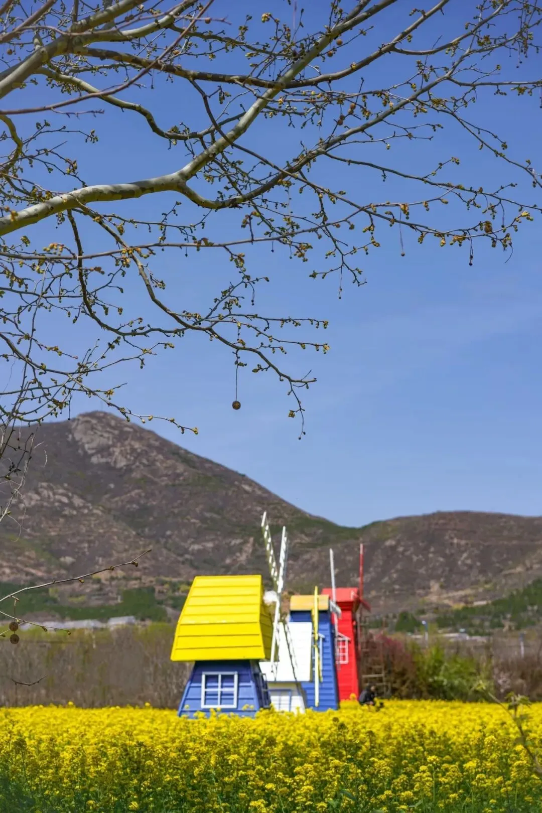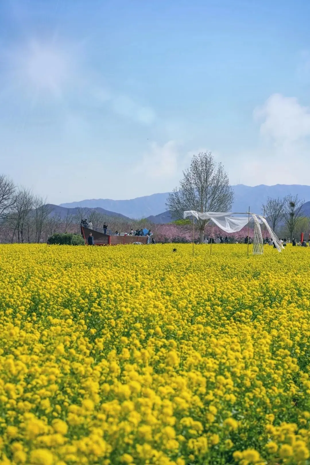 花田里有很多造景适合打卡拍照,有圈起来的小动物小朋友很喜欢。风车和飘着帷幔的休息亭满满惬意浪漫,油菜花的味道甜丝丝的。