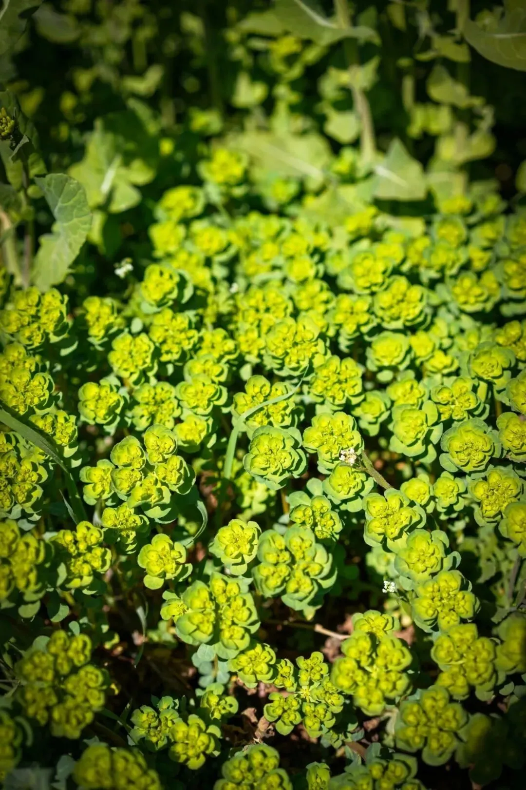 除了油菜,紫叶李和诸葛菜也正是花期。而走在油菜花田里细看脚下,还能发现成簇的泽漆。每次见泽漆都觉得它真是造物主的恩赐,怎么能生的如此精致美丽。只可惜是个和油菜相爱相杀的“蛇蝎美女”,全株有毒,折断后溢出的白浆刺激性很强,不要轻易碰。