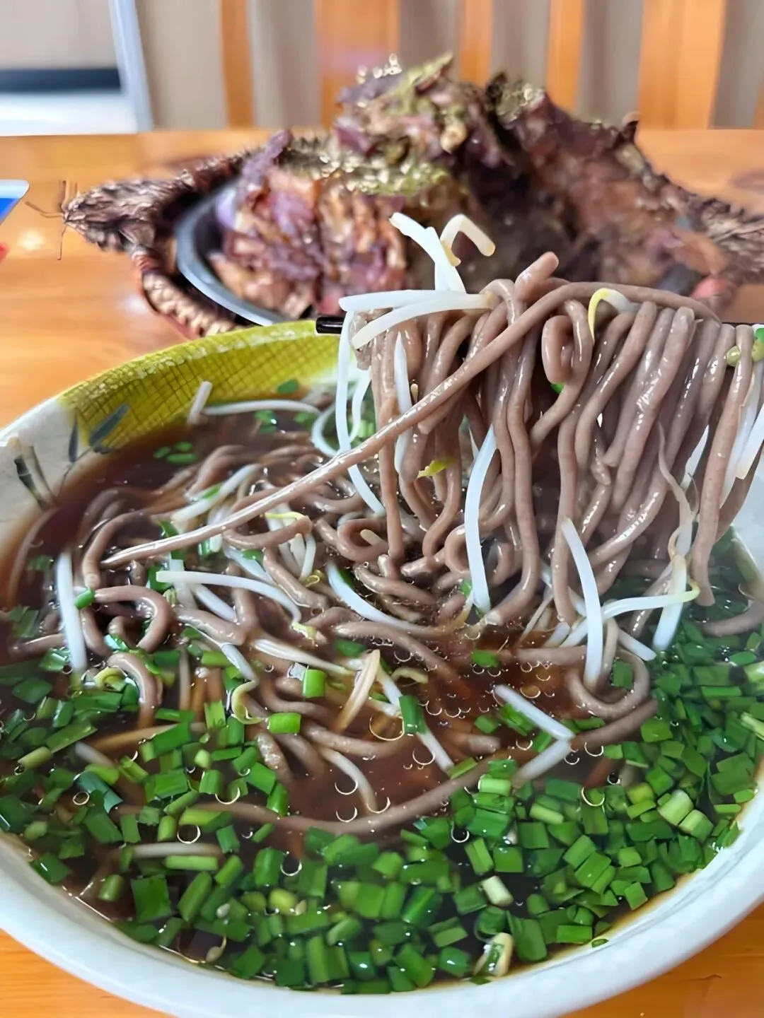 这面的讲究全在一个“压”字——用的是特制饸饹床子,壮实师傅骑在杠杆上,将和好的荞麦面团塞进去,用力一压,面条便根根滑入沸锅。煮好的饸饹劲道爽滑,带着荞麦特有的清香,浇上熬足时辰的羊骨老汤,再淋一勺羊油辣椒,撒上豆芽、香菜、蒜末。