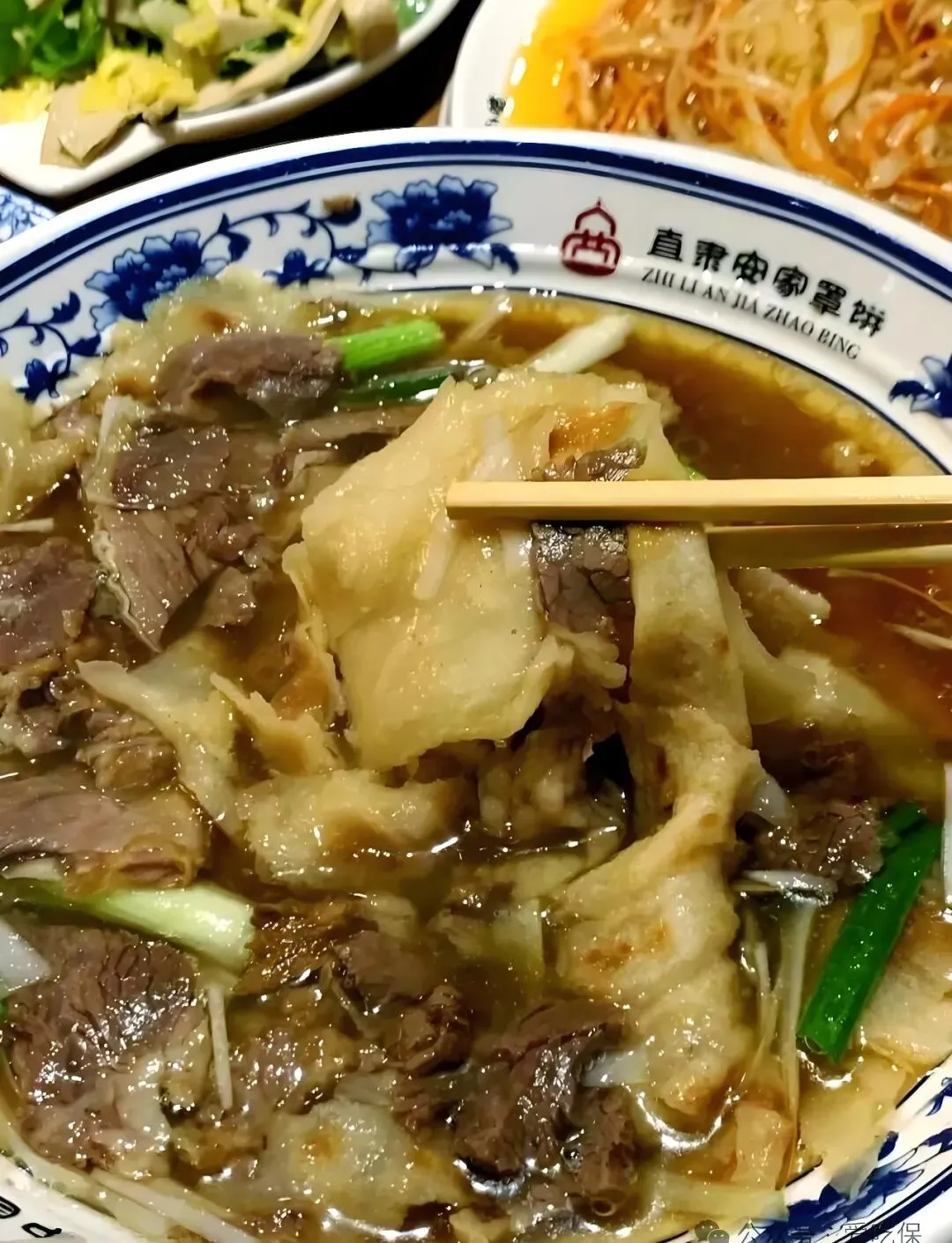 饼条吸饱汤汁,软而不烂,牛肉软烂入味,麻酱的醇香混着汤的鲜,一碗下肚,从胃里暖到心里。在白家牛肉罩饼(和平东路店),开了四十多年的清真老店,烟火气从清晨五点就开始弥漫。