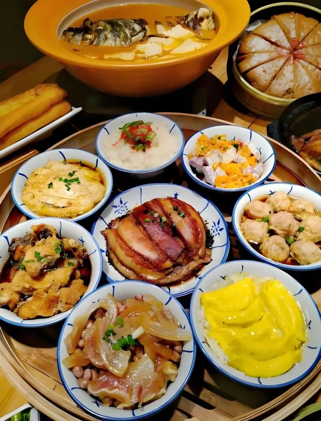 功夫全在一个“蒸”字上。扣肘子需先煮后炸,待染上琥珀色,再与方肉、酥肉、丸子一起,在笼屉里经历长达十数小时的蒸汽洗礼。当笼盖揭开,云雾翻腾间,酥烂的肘子皮肉将化未化,方肉透亮如琥珀,醇厚的香气瞬间袭来。四素碗也毫不敷衍:海带吸饱高汤,萝卜丝细如银线,平凡的食材因时光与技艺的点化而熠熠生辉。